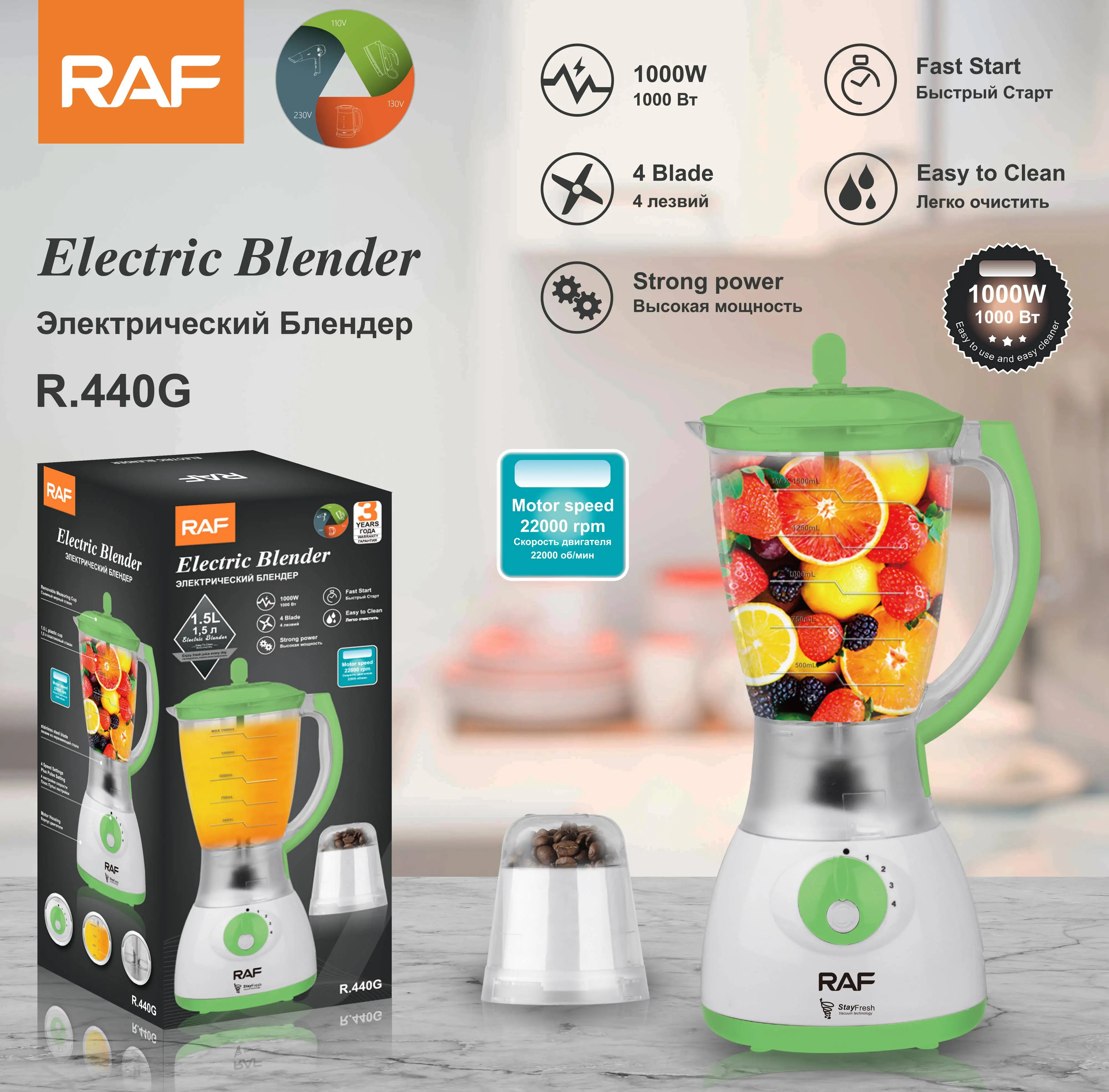 Blender Electric 2 in 1 RAF 440G, Capacitate 1.5L, Putere 1000W