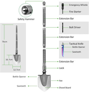 - Funcții multiple: Sapă, fierăstrău, topor, deschizător de sticle, metru de măsură, ciocan și multe altele