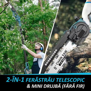Această mini drujbă fără fir este un instrument robust și eficient, perfect pentru diverse lucrări de tăiere și întreținere a grădinii. Datorită tijei extensibile reglabile, nu mai este nevoie de scară pentru a tăia ramuri la înălțime, oferindu-vă astfel un plus de siguranță și confort.